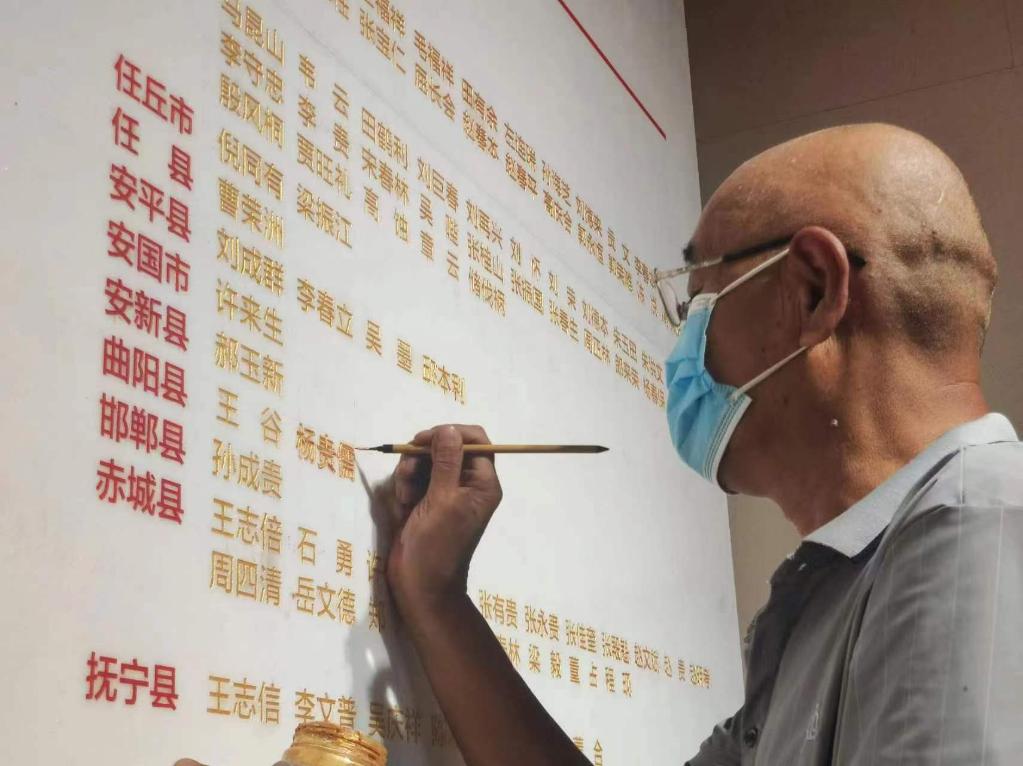 27日,工作人員將烈士楊貴儒的名字鐫刻在“平津戰役烈士名錄墻”上。受訪者供圖