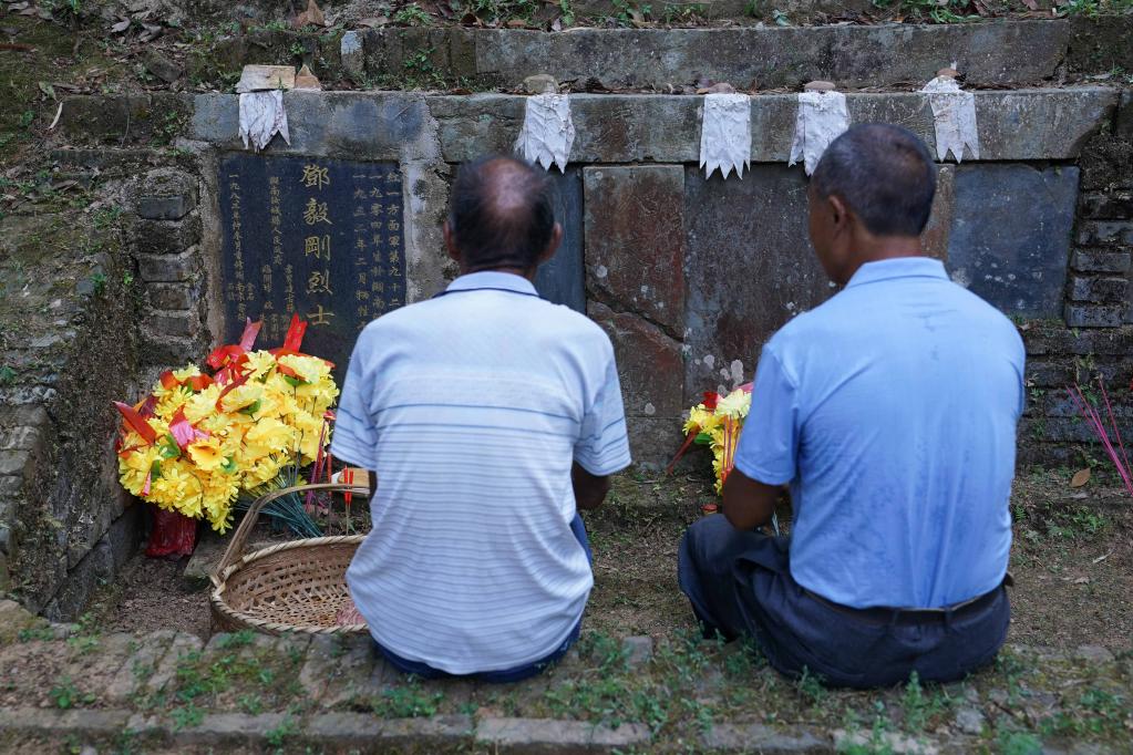 9月15日,謝南京和弟弟謝稱發一起坐在鄧毅剛烈士墓前,講村里、家里的新變化。新華社記者 周密 攝