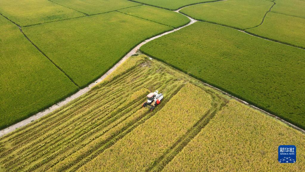 2022年9月28日,合肥市肥西縣花崗鎮(zhèn)河豐社區(qū)村民駕駛收割機(jī)收獲中稻(無人機(jī)照片)。新華社發(fā)(徐勇攝)
