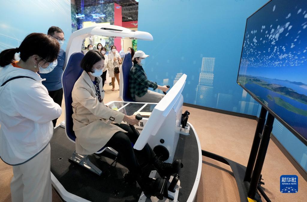 10月7日,觀眾在“奮進新時代”主題成就展上體驗操縱直升機訓練模擬器。當日是國慶長假的最后一天,大批觀眾來到北京展覽館參觀“奮進新時代”主題成就展。新華社記者 王毓國 攝