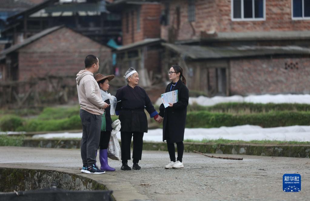 在廣西柳州市三江侗族自治縣良口鄉南寨村,紀檢監察干部(右一、左一)在了解惠農政策落實情況(2022年3月24日攝)。新華社記者 黃孝邦 攝