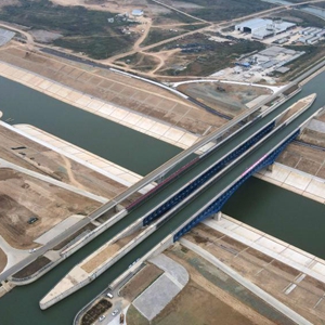 9月6日,世界單跨最大的通水通航鋼渡槽——引江濟淮工程淠河總干渠鋼結(jié)構(gòu)渡槽首次通航。淠河總干渠與引江濟淮渠道形成“河上有河船上有船”的水上立交奇觀。