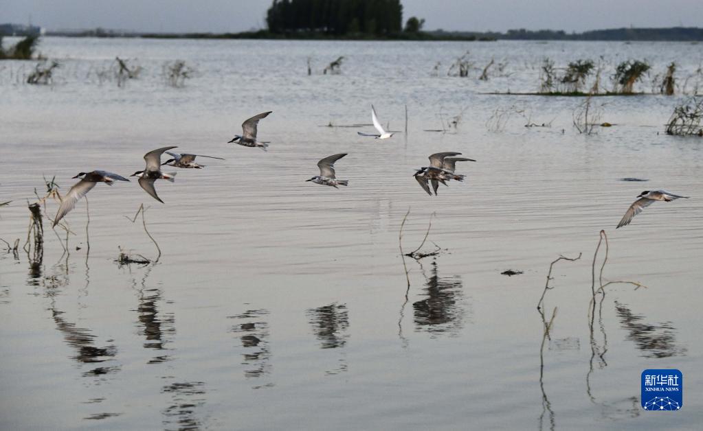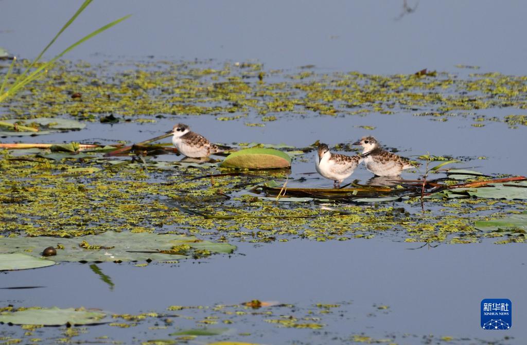 野生鳥類在生態環境優美的微山湖棲息(2022年8月23日攝)。新華社記者 徐速繪 攝