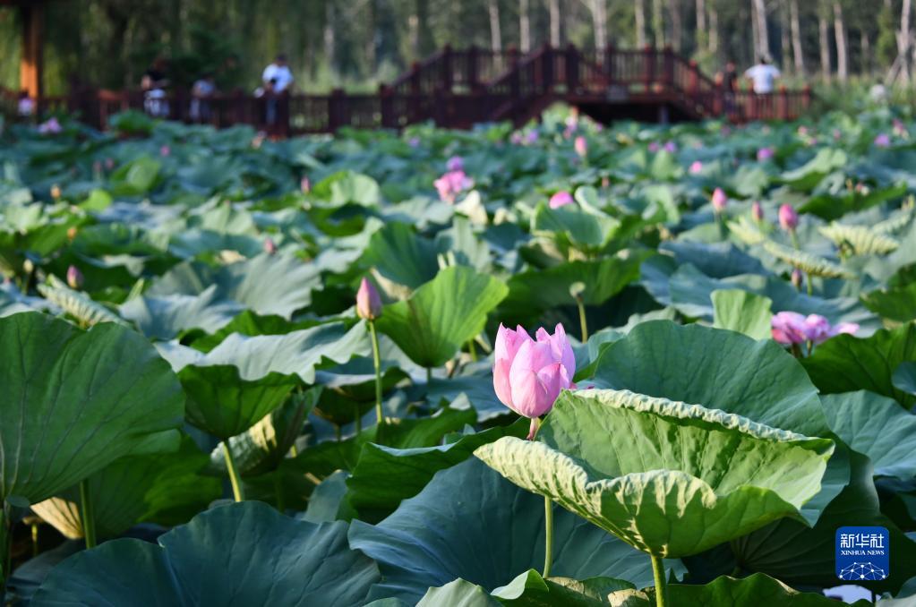 微山湖湖區內荷花盛開(2022年7月21日攝)。新華社記者 徐速繪 攝