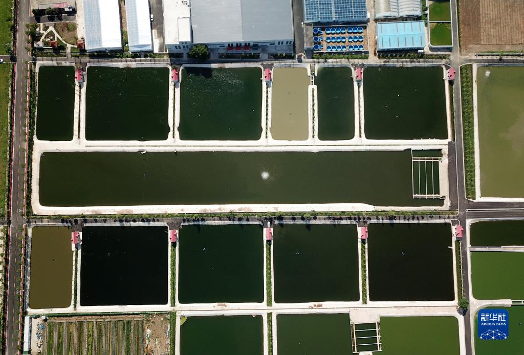 從空中俯瞰山東省微山縣現代漁業產業園生態魚塘(2022年8月23日攝,無人機照片)。新華社記者 徐速繪 攝