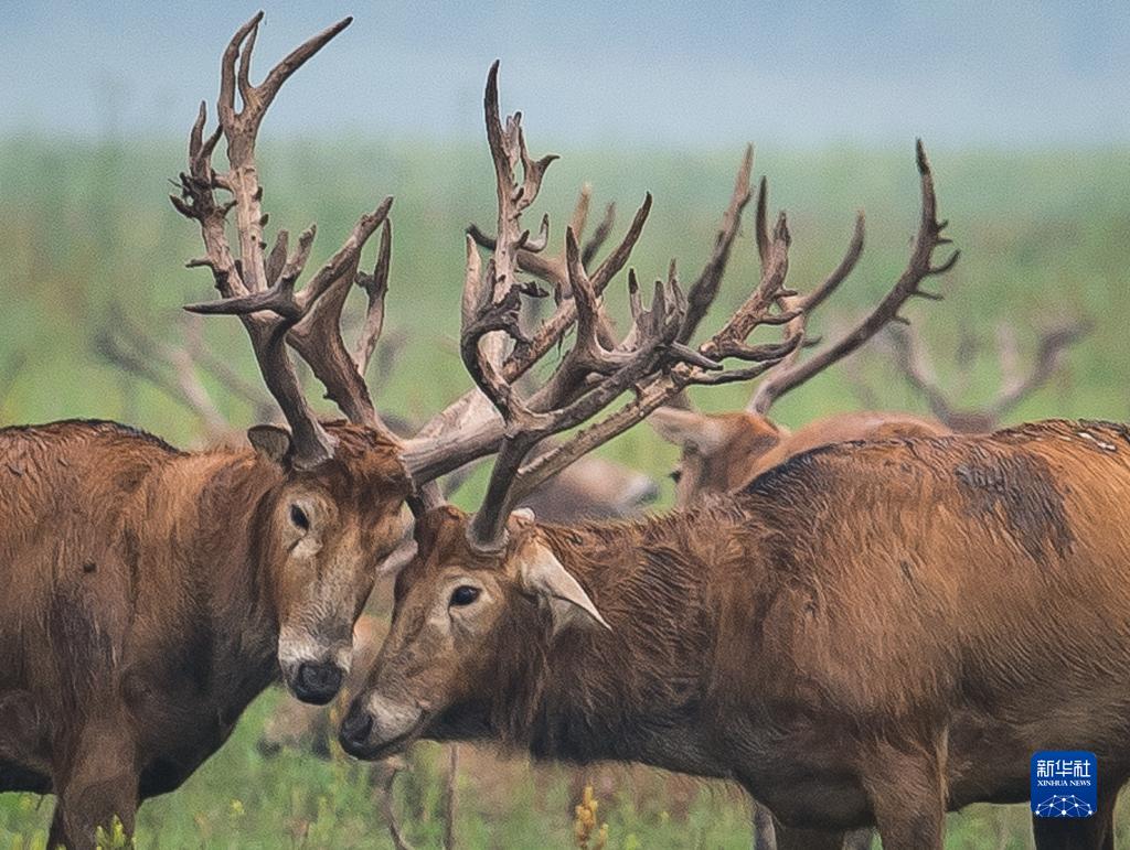 麋鹿在湖北石首麋鹿國家級自然保護區內活動(2021年5月17日攝)。新華社記者 肖藝九 攝