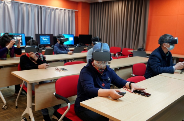 2021年11月26日,在上海老年大學欽州書院“科技島”教室,學員通過VR虛擬體驗“環球旅行”。新華社記者 劉穎 攝