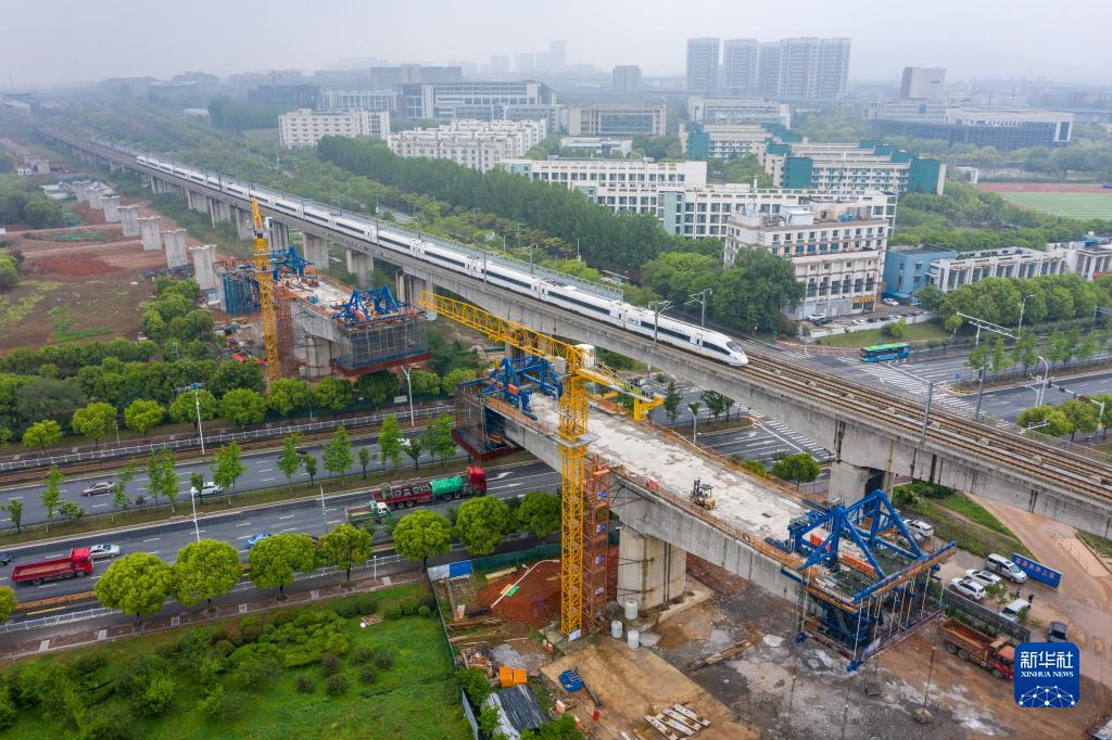 中鐵四局四公司的工程人員在江蘇南沿江城際鐵路站前Ⅰ標工程跨天元東路連續梁施工點施工作業(2021年4月27日攝,無人機照片)。新華社記者 李博 攝