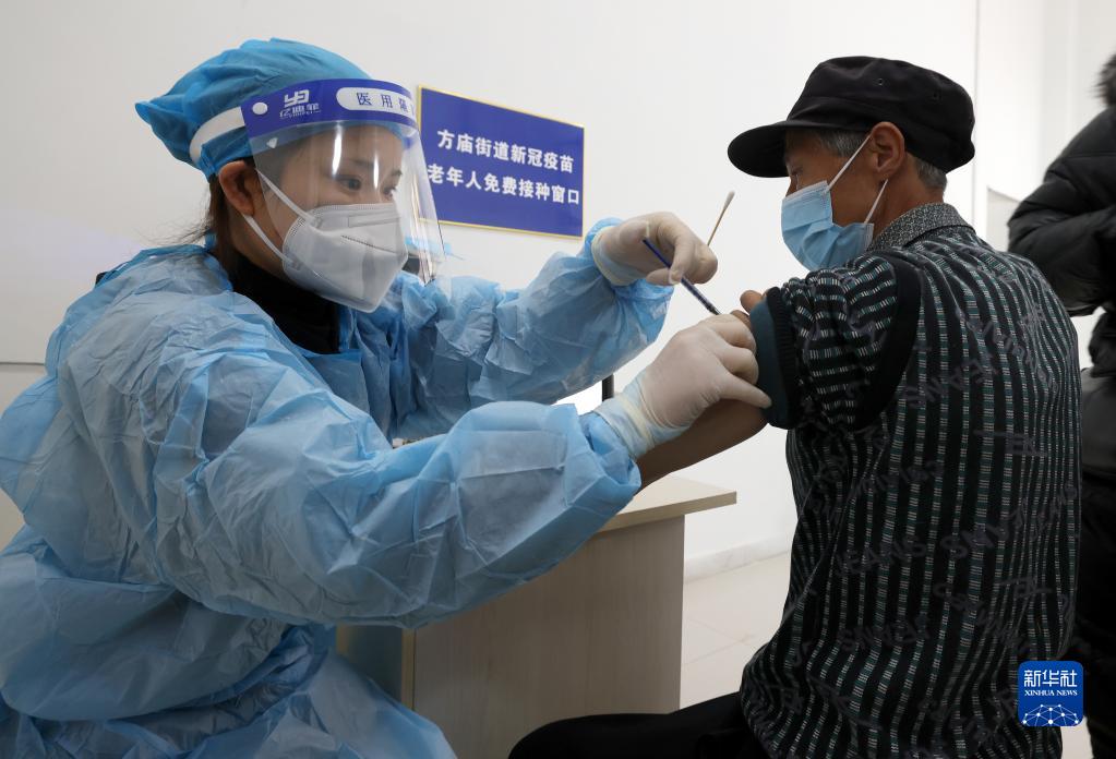 12月15日,在北京市海淀區中關村街道新冠疫苗接種點,醫護人員為老年人接種新冠疫苗。新華社記者 任超 攝