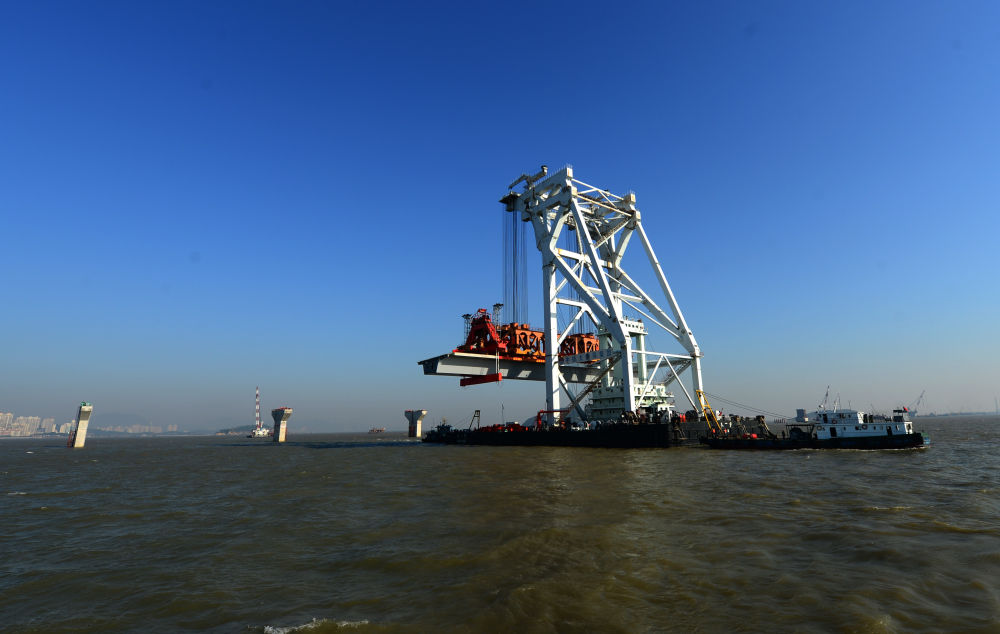 ↑ 2013年12月2日,港珠澳大橋首片組合梁在架設安裝。當天,港珠澳大橋首片組合梁被成功架設安裝在位于伶仃洋中的橋墩上。首片組合梁的成功架設標志著港珠澳大橋施工實現了由下部結構施工向上部結構施工的轉化。新華社記者程敏攝