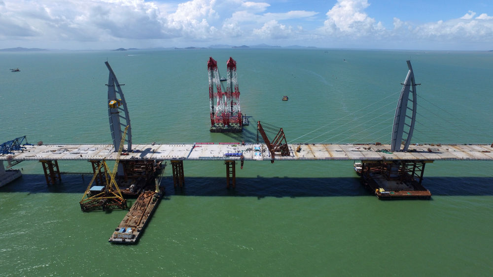 ↑ 2016年6月29日,港珠澳大橋主體橋梁合龍現場。當日,港珠澳大橋主體橋梁合龍儀式在珠海舉行。本次合龍的主體橋梁工程包括3座通航孔橋及深、淺水區非通航孔橋。