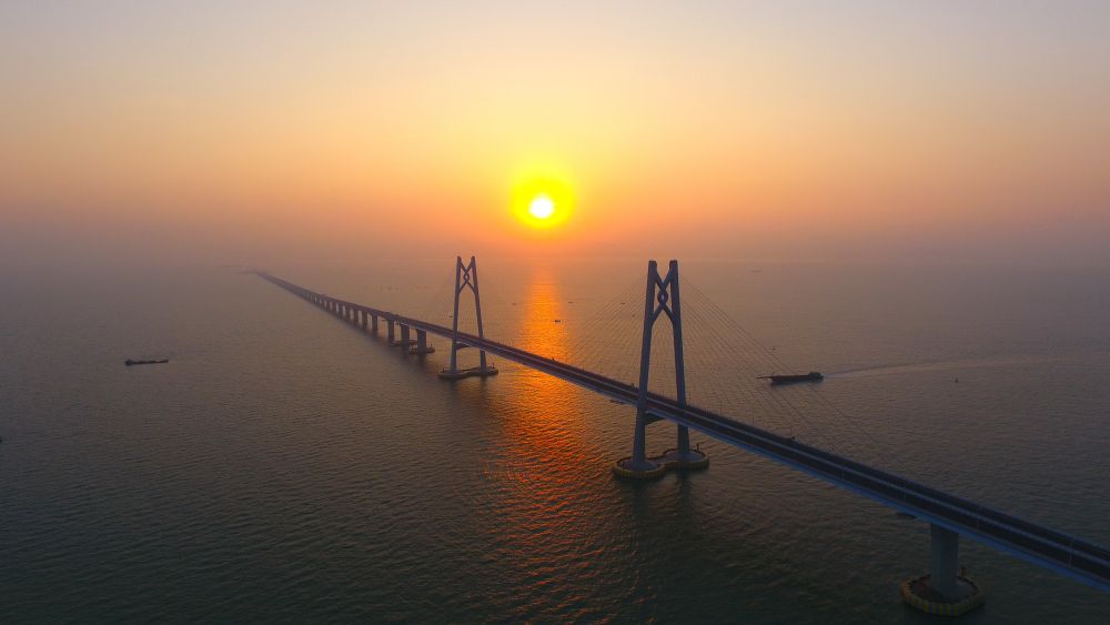 當我操作無人機飛行在浩瀚的伶仃洋上,從屏幕里看到一輪紅日躍出海面、金色的陽光穿過“中國結”橋塔、長橋臥波宛若蛟龍,內心的震撼無與倫比。