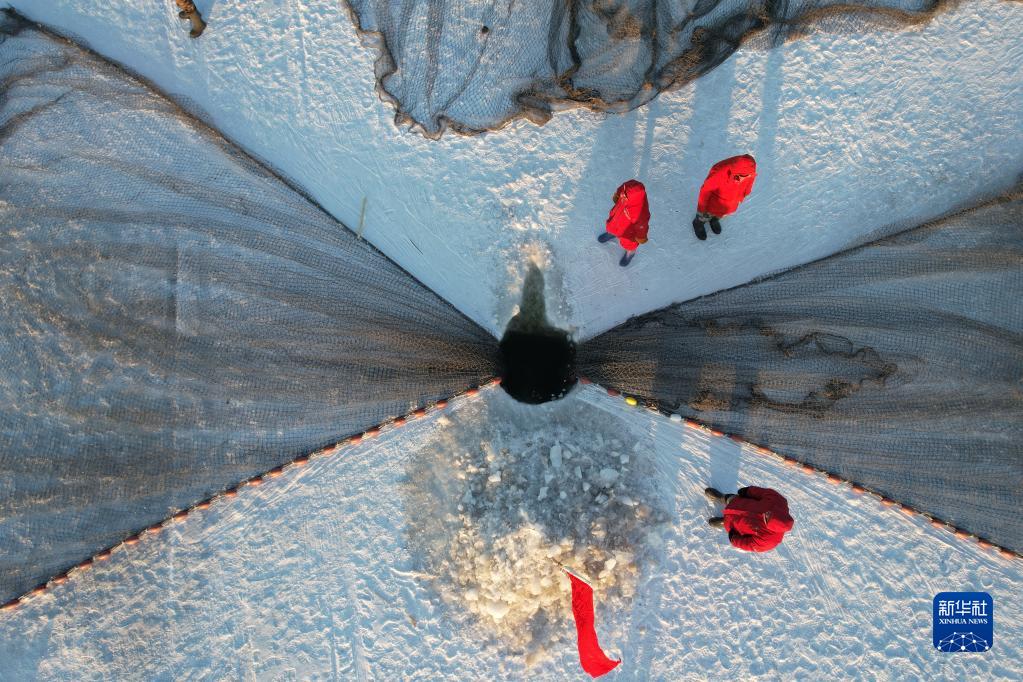 吉林省白城市鎮賚縣的哈爾淖冬捕(無人機照片,2021年12月25日攝)。新華社發(潘晟昱 攝)