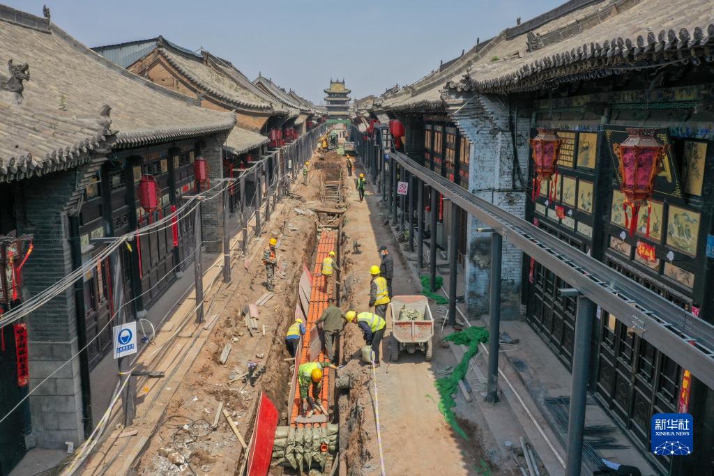 這是平遙古城內基礎設施提升改造工程施工現場(2022年4月16日攝)。新華社發(梁生仁攝)