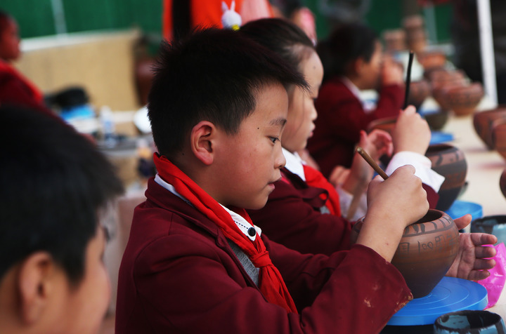 2021年10月,小朋友在仰韶村國家考古遺址公園內的考古體驗園繪制紋飾。(新華社記者 許雅楠 攝)