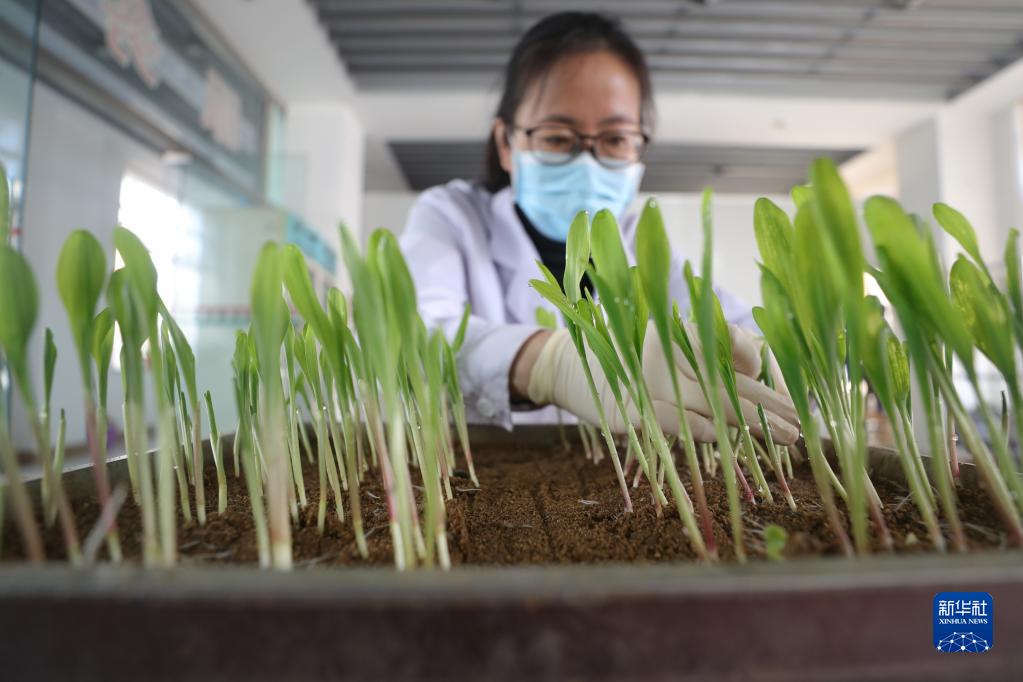 在遼寧東亞種業有限公司種子質量檢測中心,工作人員查看玉米種子發芽實驗結果(2020年3月16日攝)。新華社記者 楊青 攝