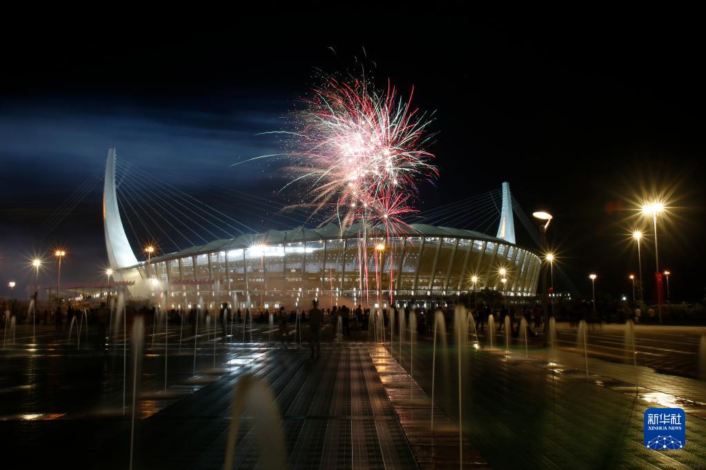 焰火在柬埔寨金邊的柬埔寨國家體育場上空燃放(2021年12月18日攝)。當日,由中國政府援建、中國建筑股份有限公司承建的柬埔寨國家體育場項目正式啟用。新華社發(索萬納拉攝)