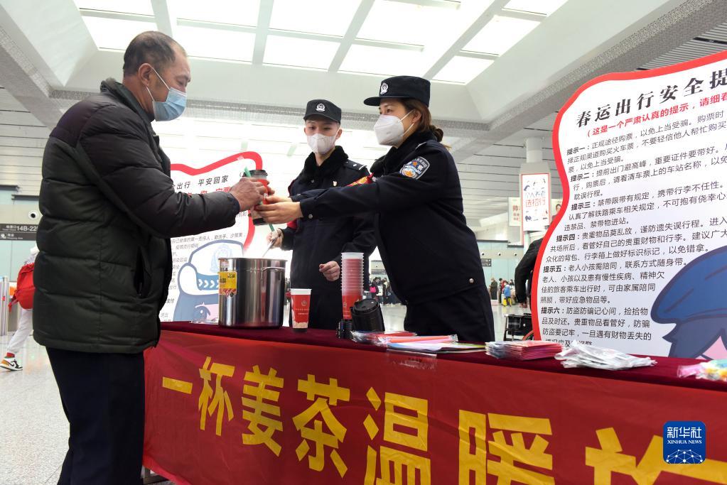 1月7日,在安徽合肥南站內(nèi),合肥鐵路公安處民警張婷(右)、王子棋(中)給一名旅客送上免費姜茶。新華社記者 郭晨 攝