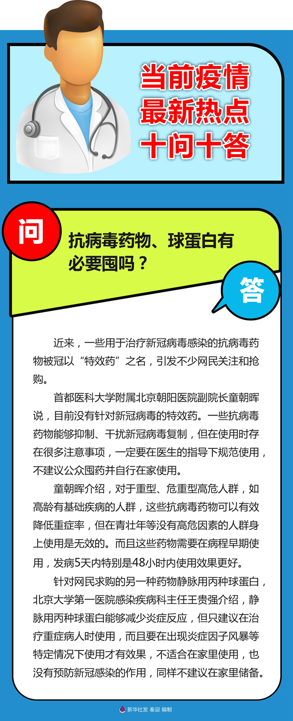 首都醫科大學附屬北京朝陽醫院副院長童朝暉說,目前沒有針對新冠病毒的特效藥。一些抗病毒藥物能夠抑制、干擾新冠病毒復制,但在使用時存在很多注意事項,一定要在醫生的指導下規范使用,不建議公眾囤藥并自行在家使用。