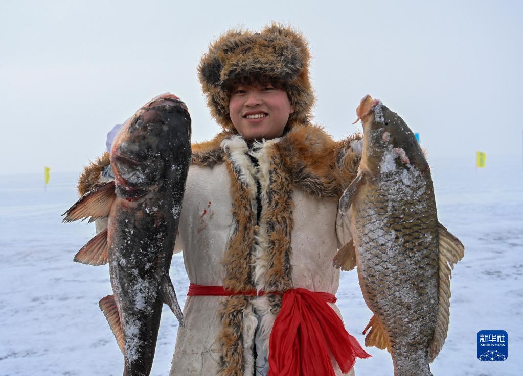 2023年1月7日,在新疆福??h第十六屆烏倫古湖冬捕文化旅游節上,漁工展示捕到的魚。新華社記者 李響 攝