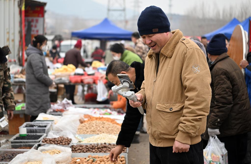 市民在西路莊大集上直播。(新華社記者李然 攝)