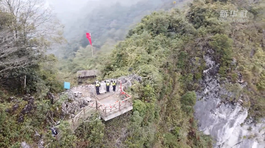 在廣西那坡縣邊境線上,588號界碑屹立在百南鄉紅石山1096米的懸崖之上,通往界碑的巡邊棧道如同“天梯”一般,緊挨著懸崖絕壁曲折蜿蜒而上。