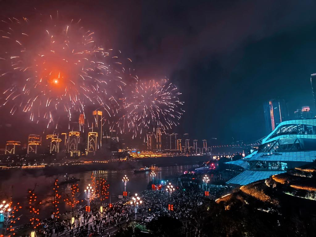 除夕夜,游客市民在重慶南濱路觀賞光影無(wú)人機(jī)焰火表演。重慶市南岸區(qū)文旅委供圖