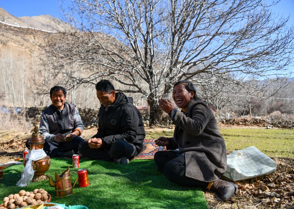 山南市加查縣拉崗村村民在核桃樹(shù)下聊天拉家常(2月1日攝)。新華社記者晉美多吉 攝