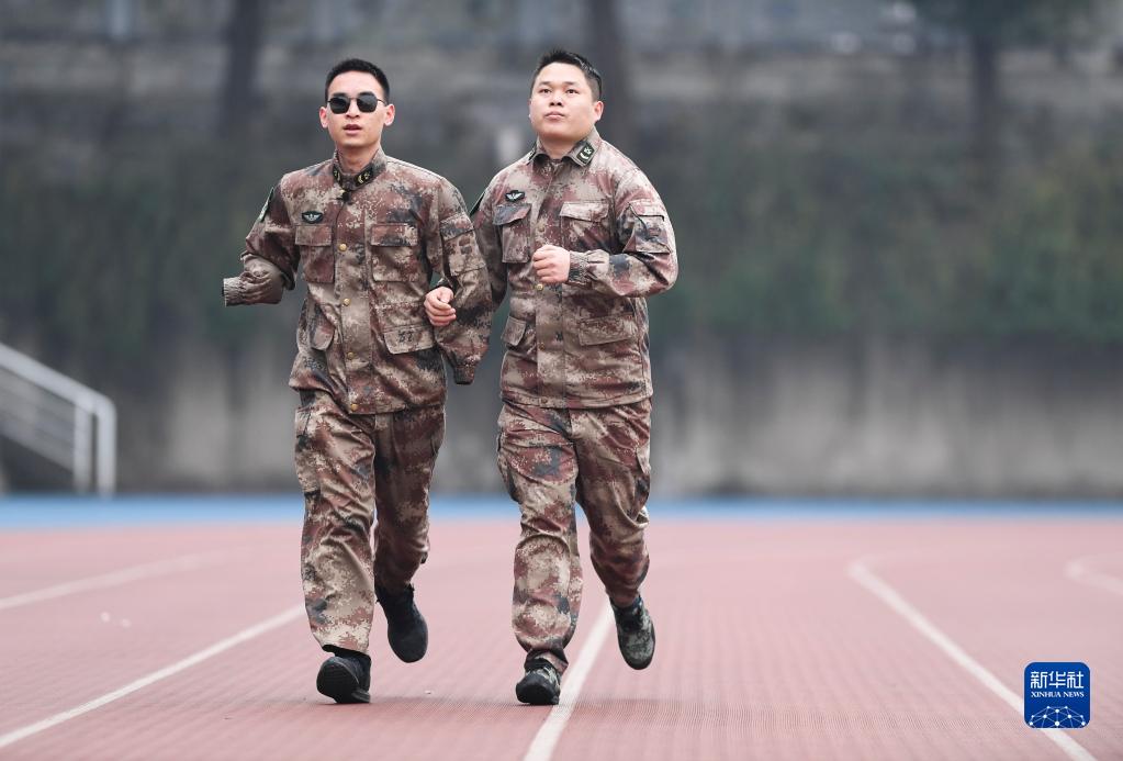 2020年1月2日,“排雷英雄戰(zhàn)士”杜富國(guó)(左)和戰(zhàn)友在陸軍軍醫(yī)大學(xué)操場(chǎng)上跑步。新華社記者 王全超 攝