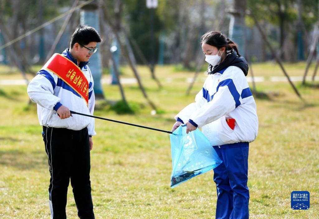 2022年3月5日,在江蘇省揚(yáng)州市江都區(qū)雙擁公園,江都區(qū)第二中學(xué)學(xué)生在學(xué)雷鋒主題活動(dòng)中撿拾垃圾。新華社發(fā)(任飛 攝)