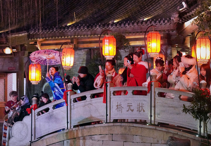 游客在洛陽市洛邑古城內游玩拍照(2月22日攝)。新華社記者 李安 攝