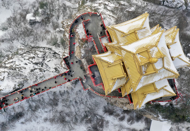 游客在洛陽市欒川縣老君山風景區游玩(2月23日攝,無人機照片)。新華社記者 李安 攝