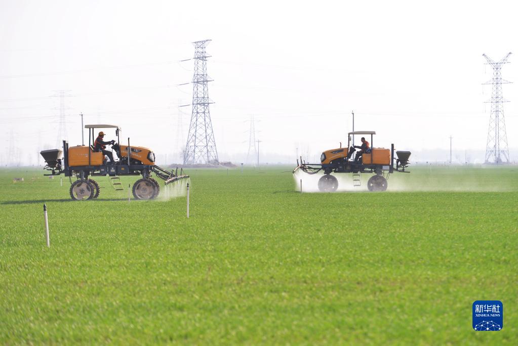 河北省晉州市槐樹鎮北白水村一家農業合作社的社員操作農業機械給冬小麥噴灑農藥(2023年3月14日攝)。新華社記者 楊世堯 攝