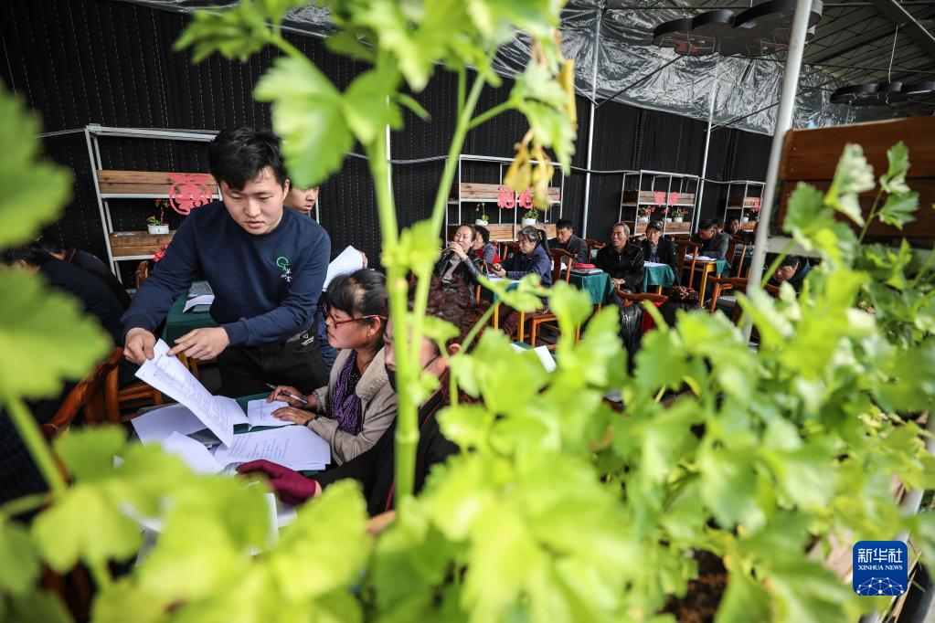 在遼寧省盤錦市大洼區田家街道大堡子村,回鄉創業大學生郭佳明(前左)在培訓課上回答農民提出的問題(2019年4月15日攝)。新華社記者 潘昱龍 攝