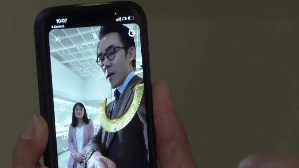 為了豐富觀眾的體驗(yàn),展覽特別介紹歷代金器的制作工藝,并利用AI技術(shù),讓觀眾試戴“虛擬”黃金飾品,增強(qiáng)觀眾與文物之間的互動(dòng)性。