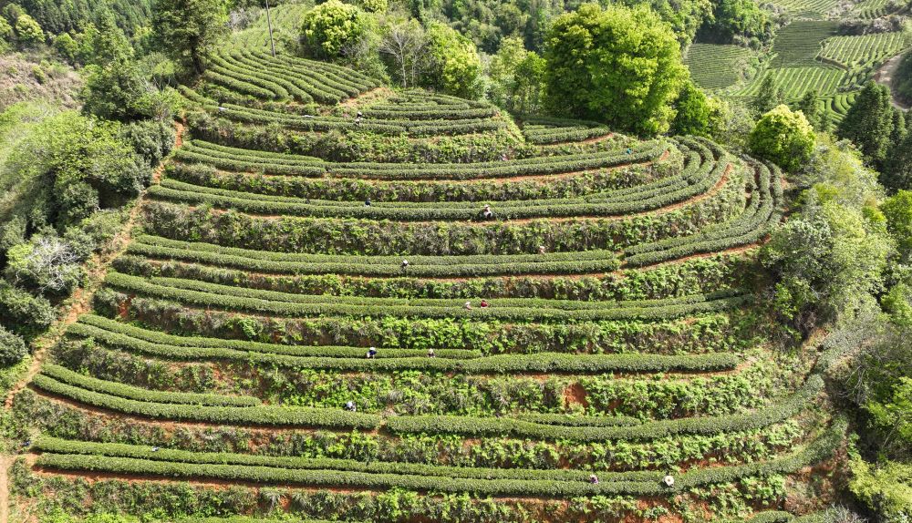 在福建省武夷山市,采茶女工在茶山采茶(無人機照片,2023年4月7日攝)。新華社發(邱汝泉 攝)