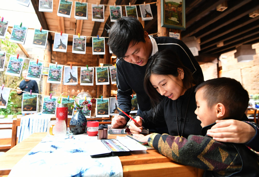 來自江西省吉安市的胡文亮是福建省寧德市屏南縣龍?zhí)洞逡M的文創(chuàng)和專業(yè)設計人才。2020年5月,他投資六十多萬元翻新改造的兼具酒館、民宿和陶藝等功能的文創(chuàng)空間正式開業(yè)。“十一”黃金周期間接待游客近800人次。這是胡文亮(左一)和愛人曾婉珍(中)、小孩一起在繪制龍?zhí)洞逯黝}明信片(2020年10月21日攝)。新華社記者 魏培全 攝