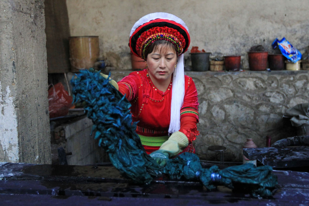 蒼山腳下、洱海之畔,綠樹紅花競相開放。在云南省大理市喜洲鎮(zhèn)周城村,青瓦白墻的璞真扎染博物館內,一位位白族村民的手下,藍白交織的白族扎染正在如花綻放。