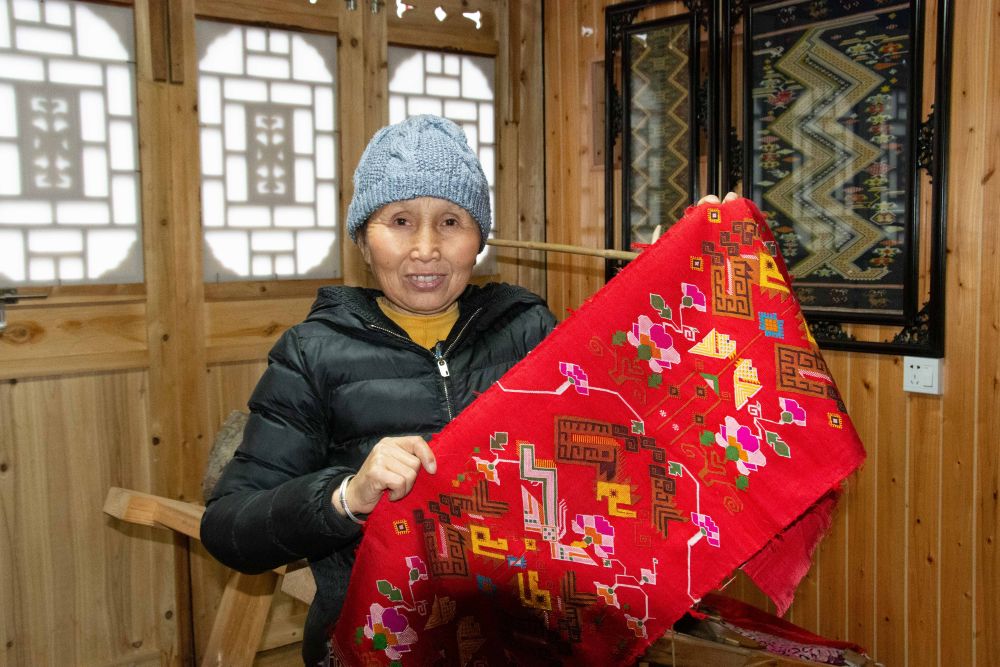 2022年1月7日,土家織錦國家級非遺傳承人劉代娥在湖南省龍山縣苗兒灘鎮(zhèn)撈車村展示自己做的土家織錦。新華社記者 柳王敏 攝