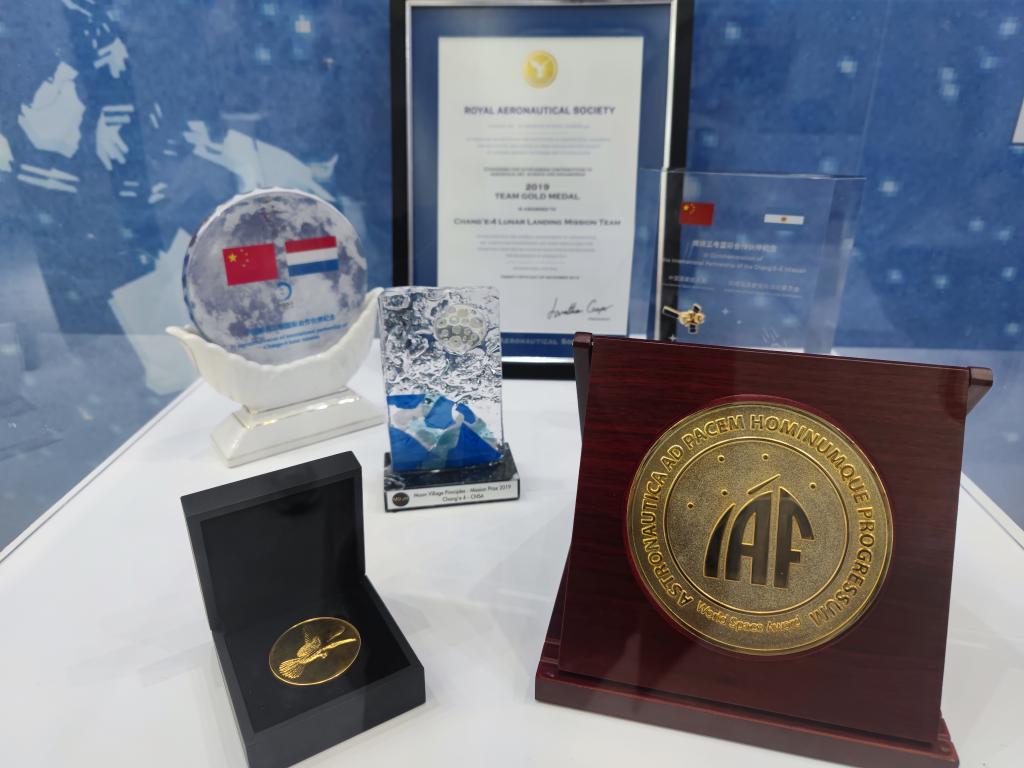 中國在深空探測領域的貢獻也受到了全球高度評價。在深空探測重大工程展區的一個展示柜中,閃亮的紀念牌和徽章向參展者講述著國際合作的碩果:嫦娥四號團隊獲得英國皇家航空學會金獎、天問一號團隊獲得世界航天獎……