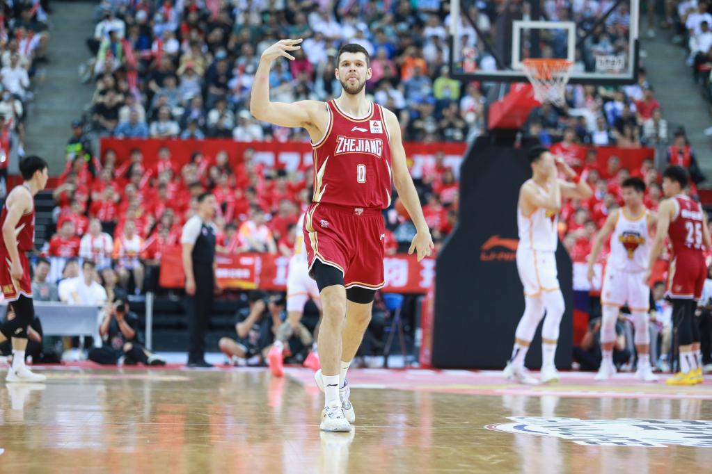 4月30日,浙江隊球員拉科塞維奇在比賽中慶祝得分。新華社發(彭志剛攝)