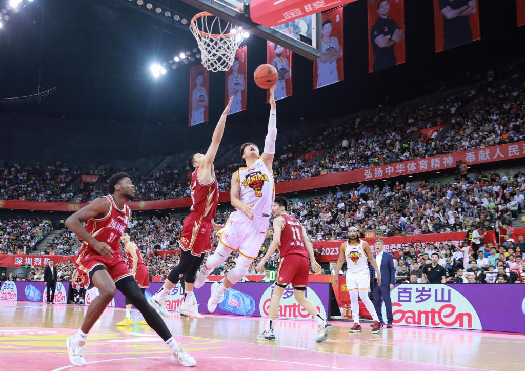 4月30日,深圳隊孫浩欽(中)在比賽中上籃。新華社發(彭志剛攝)
