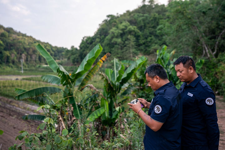 亞洲象監測員彭金福(左)和普永兵在云南省西雙版納州景洪市大渡崗鄉大荒壩村使用無人機監測象群(5月11日攝)。新華社記者 胡超 攝
