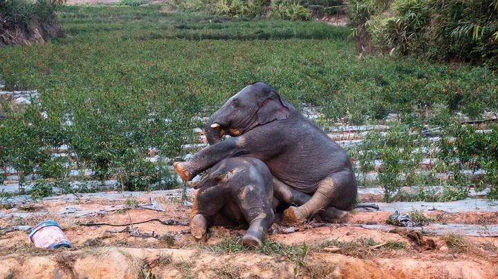 兩頭小象在云南省西雙版納州景洪市大渡崗鄉大荒壩村玩耍(5月9日攝,無人機照片)。新華社記者 胡超 攝