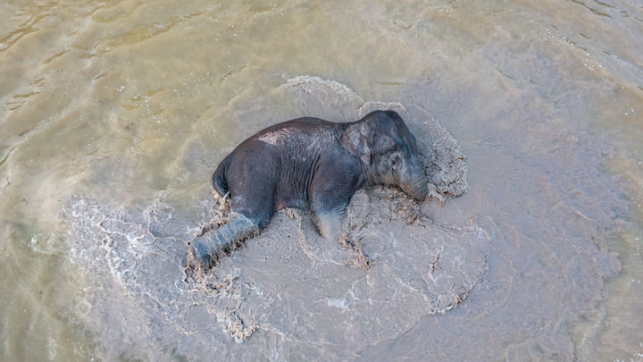 一頭野象在云南省西雙版納州景洪市大渡崗鄉大荒壩村一處魚塘里“洗澡”(5月9日攝,無人機照片)。新華社記者 胡超 攝