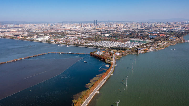 云南昆明滇池一景(2023年1月12日攝,無(wú)人機(jī)照片)。新華社記者 胡超 攝