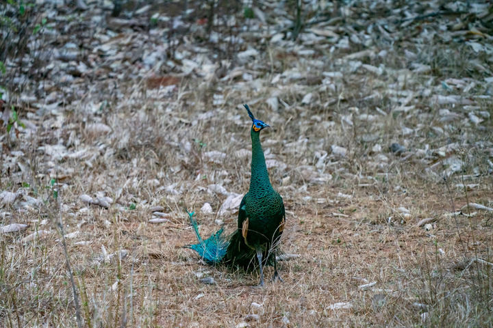 在云南楚雄雙柏縣恐龍河自然保護(hù)區(qū)拍攝的綠孔雀(2023年4月20日攝)。新華社記者 胡超 攝