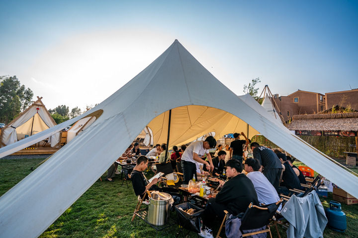 游人在滇池南岸晉寧區(qū)上蒜鎮(zhèn)小漁村露營(yíng)游玩(2023年4月27日攝)。新華社記者 胡超 攝