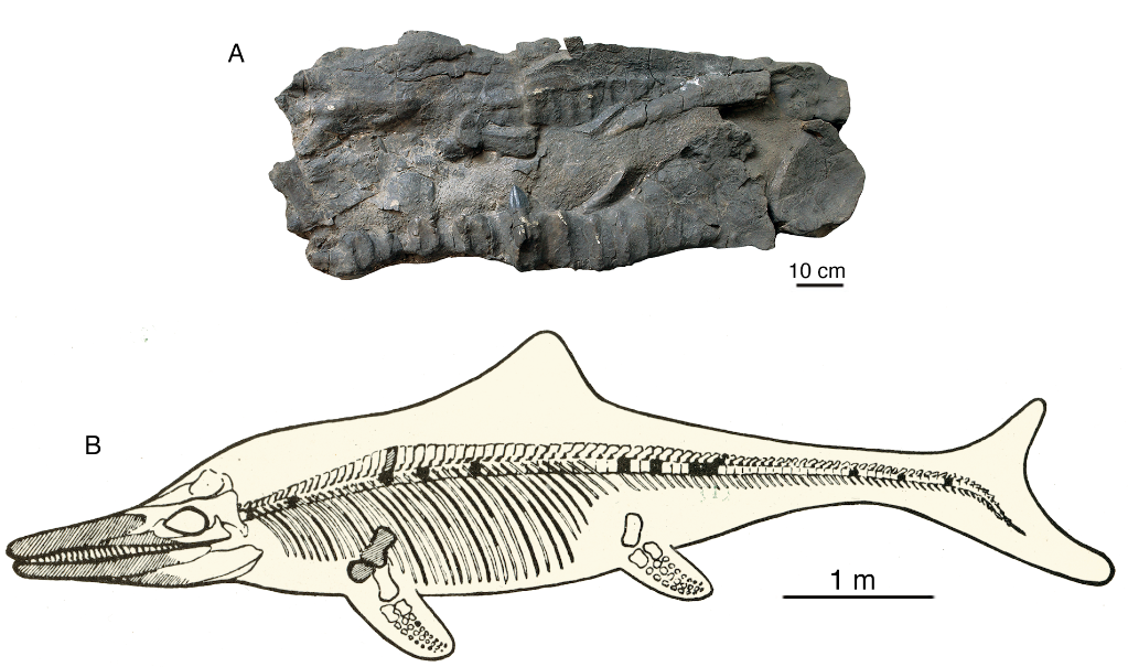 喜馬拉雅魚龍化石及復原圖。(中國科學院古脊椎動物與古人類研究所供圖)