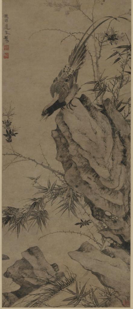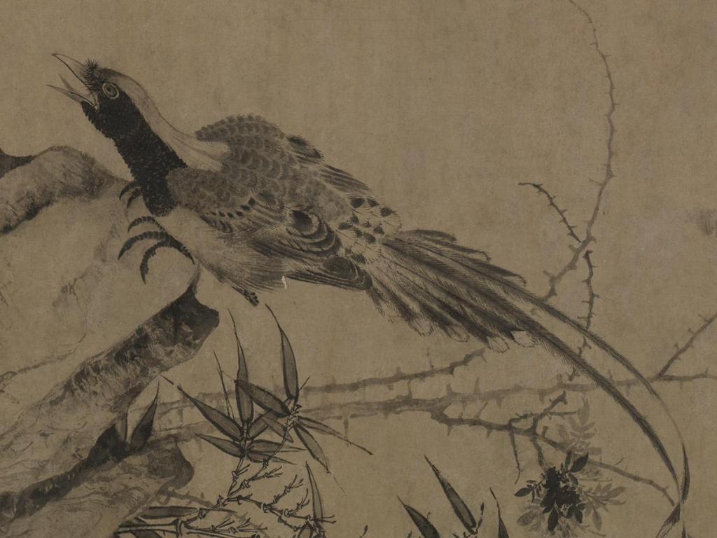 此畫最吸引人的是圖中禽鳥的畫法。在中國傳統(tǒng)繪畫中,大多數(shù)畫家在描繪禽鳥的時候都會使用絢麗的色彩,以便突出禽鳥身上的羽毛,但在這幅作品上,邊魯僅用墨色就取代了那些豐富的色彩。他以墨色的濃淡深淺、干濕相宜的變化和適度留白將禽鳥五彩斑斕的羽毛表現(xiàn)得淋漓盡致。